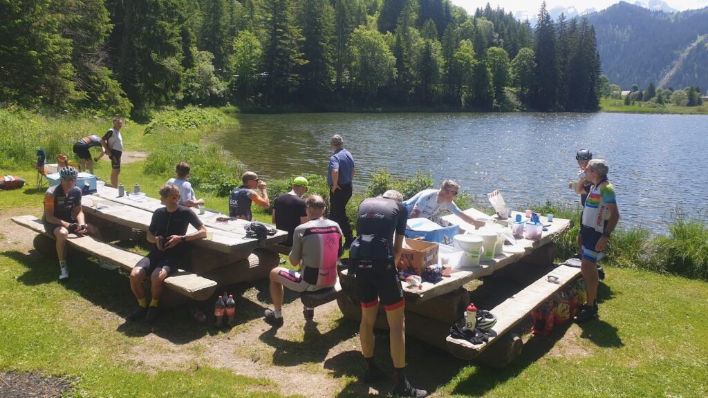 Und auf der Königsetappe am Dienstag (145km, 3180HM) bot uns die Sonne einen sehr angenehmen Start über den Col de la Croix sowie einen recht heissen Anstieg zum Pas de Morgins. Für etwas Abkühlung sorgte dann der „Regensprutz“, den alle Gruppen auf dem Schlussanstieg von Aigle nach Les Diablerets abbekamen. Aber wie es bereits Marc Cavendish sagte: Lieber ein leicht verregneter Tag auf dem Fahrrad als keine Radausfahrt. 😉