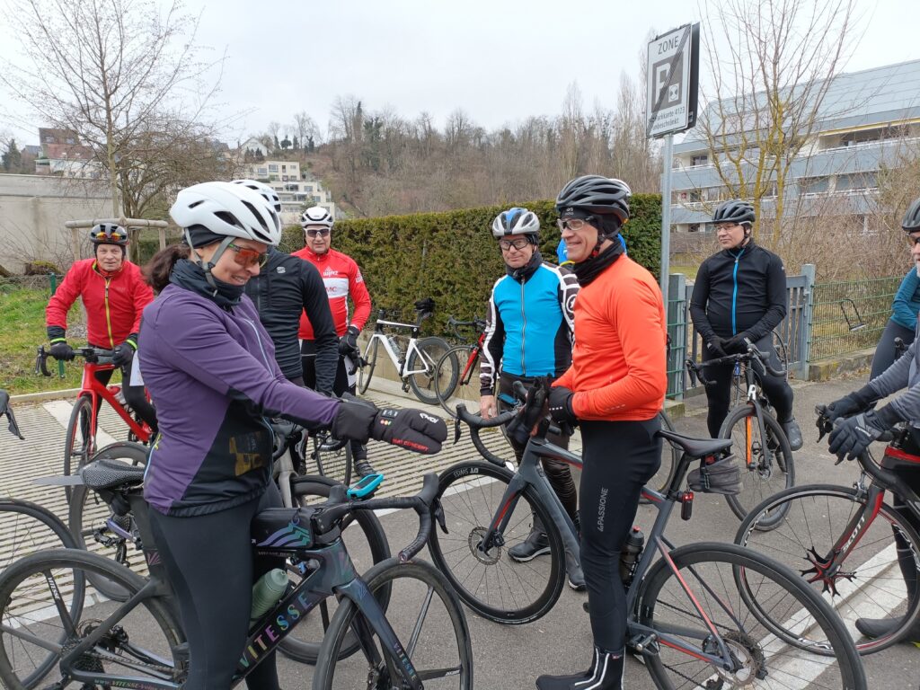 In warme Kleider eingepackt starteten am Sonntagmorgen, den 2. Februar, 14 Velofahrer:innen am Zoll in Allschwil zu einer klassischen Runde im nahen Sundgau. Die grosse Gruppe, perfekt angeführt von Stephan und Dominic, passierte kompakt und in geordneter 2er-Formation diverse typische Dörfer des Elsass. Das ständige Auf und Ab in der sanft hügeligen Landschaft liess die Kälte schnell vergessen.