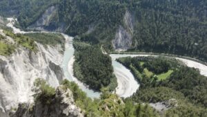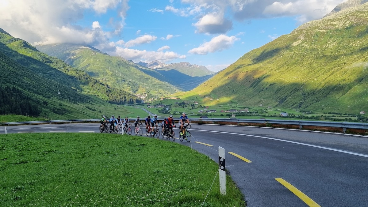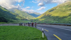 Nach kurzem Einrollen geht es in Andermatt direkt in den gut 10 km langen Anstieg zum Oberalppass. Die Steigung ist sehr gleichmässig und in den frühen Morgenstunden sind die 600 Höhenmeter rasch bewältigt. In einigen Serpentinen führt die eigentliche Passstrasse hinunter in den Ort Tschamut. Danach geht es via Sedrun, Disentis, Trun bis nach Ilanz auf mehrheitlich abfallender Strecke durch die Surselva. Nach Ilanz beginnt der Anstieg nach Versam. Die Strasse führt uns weiter durch die Rheinschlucht mit imposanten Ausblicken in die Schlucht und den tief unten gelegenen Vorderrhein. Nach Bonaduz geht es vorbei an einigen Burgen und Schlössern nach Sils im Domleschg. Via Tiefencastel erreichen wir Surava – hier beginnt der Schlussanstieg durchs Landwassertal. Nach Davos Wiesen folgt aber nochmals eine kurze Abfahrt hinunter zum 2.7 km langen Landwassertunnel und kurz danach erreichen wir auch schon unsere Unterkunft in Davos Glaris. Leider lässt sich der Landwassertunnel nicht umfahren, deshalb erachten wir auf der heutigen Etappe ein Rücklicht als zwingend.